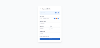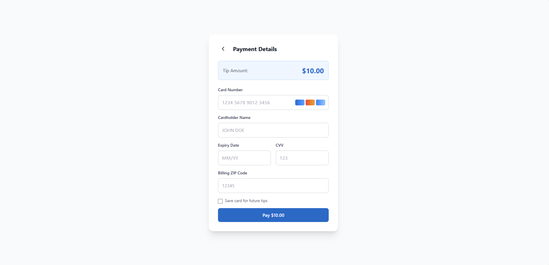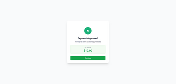 A clean UI-based tipping + checkout flow simulator made in HTML/JS. Choose a tip amount, enter mock card details, watch the “processing” step, then get an approved screen + thank you page.